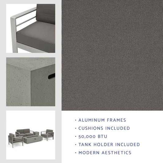Crested Bay 5pc Modern Outdoor Aluminum Sofa & Chairs Set With Fire Pit