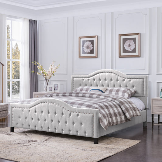 Gentry Contemporary Button-Tufted Camelback Queen Bed Frame with Nailhead Trim