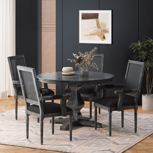 Mores French Country Upholstered Wood and Rattan 5 Piece Circular Dining Set