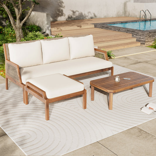 Gossame 3 Piece Acacia Wood Patio Furniture Set, Outdoor Wicker Furniture Sectional Sofa Set with Coffee Table, 4 Seats Sofa Deep Seating with Soft Cushions