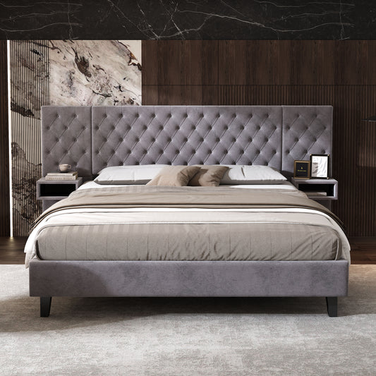 Meridia Platform Bed with Headboard, Modern Velvet Upholstered Platform Bed with 2 Nightstands, with diamond tufted