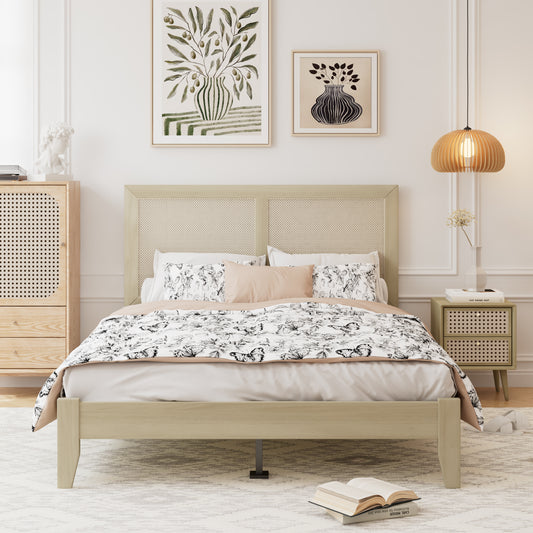 Linenwood Eudoca Rubber Wood Platform Bed with Rattan Woven Headboard, Natural