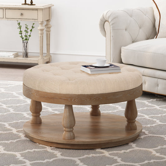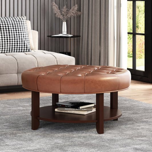 Baynes Contemporary Faux Leather Tufted Wood Round Ottoman with Open Shelf