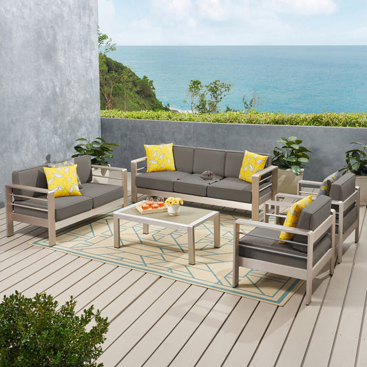 Crested Bay Outdoor Aluminum 7 Seater Chat Set with Cushions, Silver and Khaki