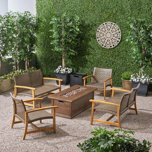 Rachel Outdoor 6 Piece Wood and Wicker Chat Set with Fire Pit