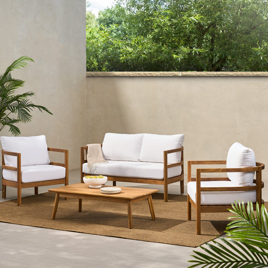 Aggie Outdoor Acacia Wood 4-Seater Chat Set with Cushion, Teak and White