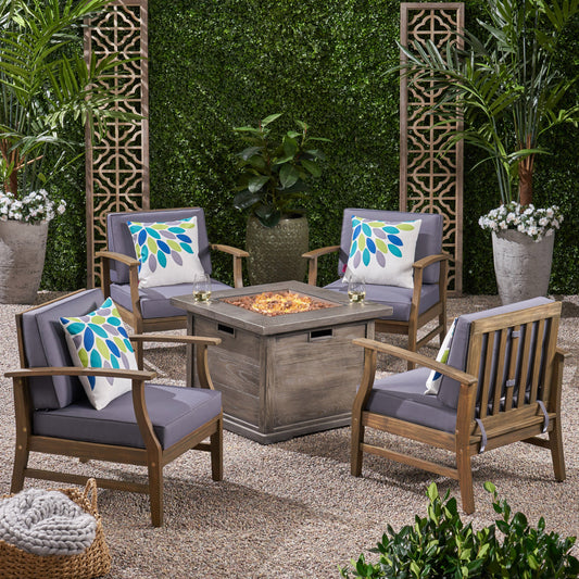 Lilith Outdoor 5 Piece Acacia Wood Club Chair and Fire Pit Set, Gray Finish and Gray