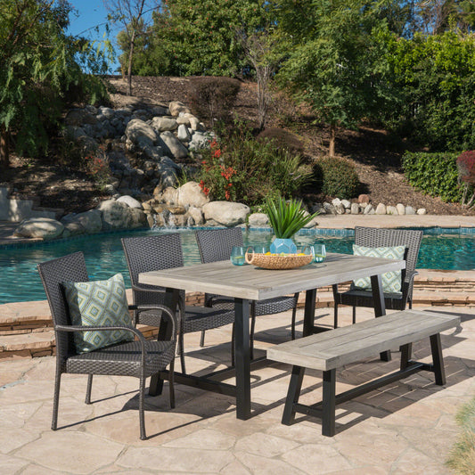 Luminous Outdoor 6 Piece Stacking Wicker Dining Set with Acacia Wood Table and Bench