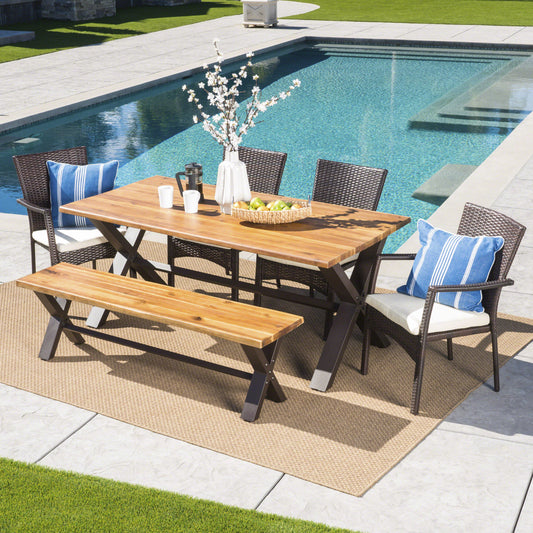 Brent Outdoor 6 Piece Acacia Wood Dining Set with Wicker Dining Chairs