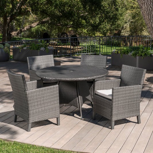 Cyril Outdoor 5 Piece Wicker Round Dining Set with Water Resistant Cushions