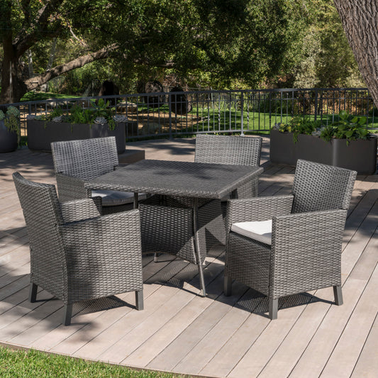 Cyril Outdoor 5 Piece Wicker Square Dining Set with Water Resistant Cushions