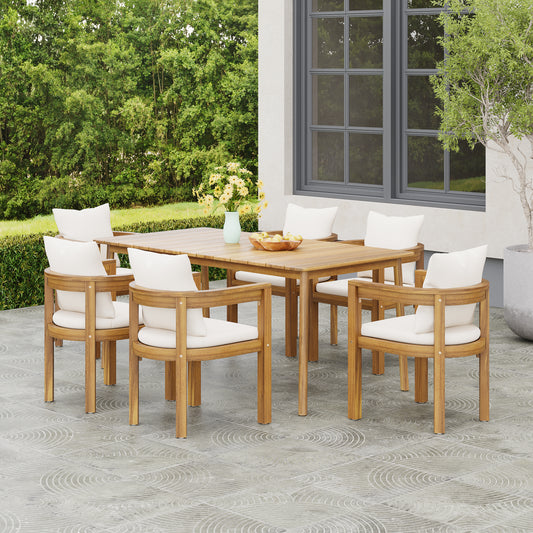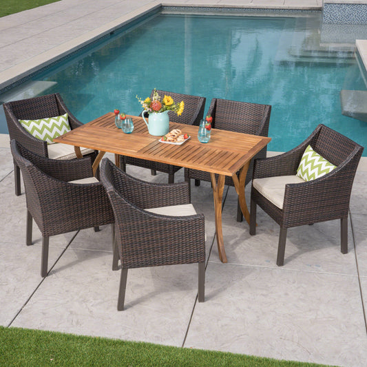Abel Outdoor 7 Piece Acacia Wood/ Wicker Dining Set with Cushions, Teak Finish and Multibrown with Beige