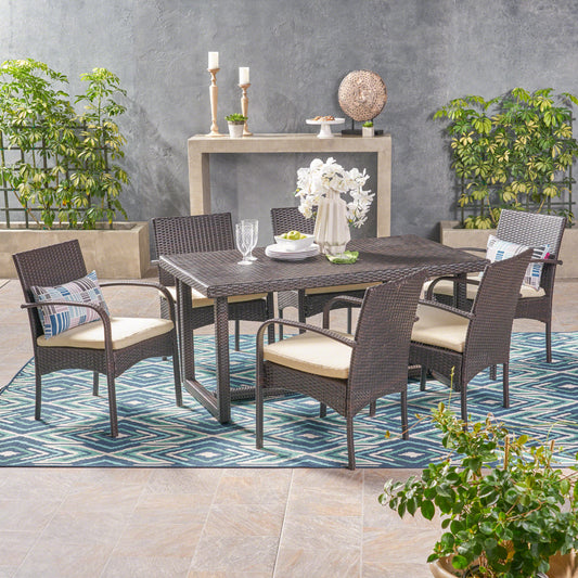 Able Outdoor Transitional 7-Piece Multi-Brown Wicker Dining Set with Cushions