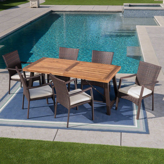 Landon Outdoor 7 Piece Dining Set with Teak Finished Wood Table and Brown Chairs