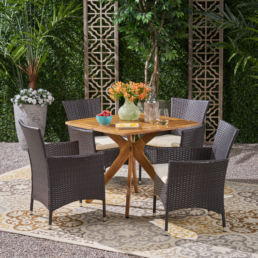 Marcy Outdoor 5 Piece Acacia Wood/ Wicker Dining Set with Cushions, Teak Finish and Multibrown with Beige