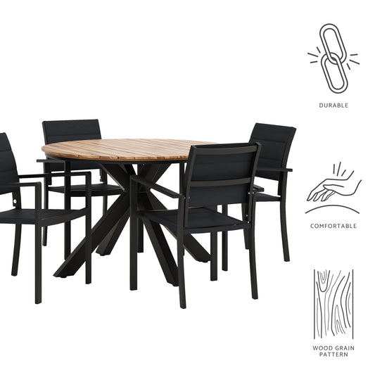 Mellie Outdoor Mesh and Acacia Wood 5 Piece Dining Set, Black and Teak