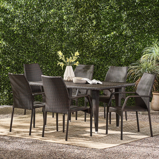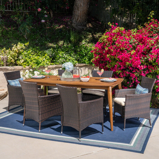 Matthew Outdoor 7 Piece Multibrown Wicker Dining Set with Teak Finish Rectangular Acacia Wood Dining Table and Beige Water Resistant Cushions