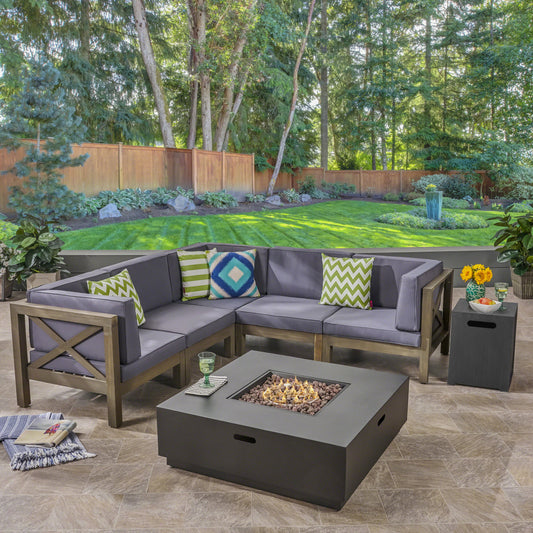 Gina Outdoor Acacia Wood 5 Seater Sectional Sofa Set with Fire Pit