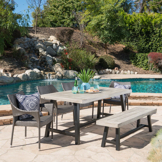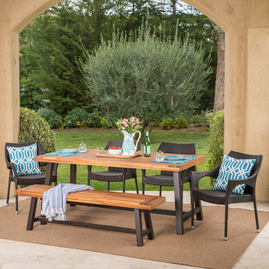 Flora Outdoor 6 Piece Wicker Dining Set with Acacia Wood Table and Bench