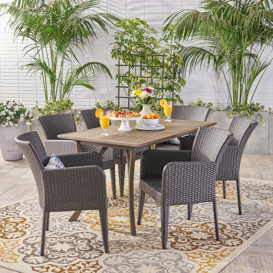 Elle Outdoor 7 Piece Acacia Wood Dining Set with Stacking Wicker Chairs
