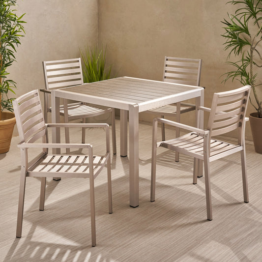 Cherie Outdoor Modern 4 Seater Aluminum Dining Set with Faux Wood Table Top