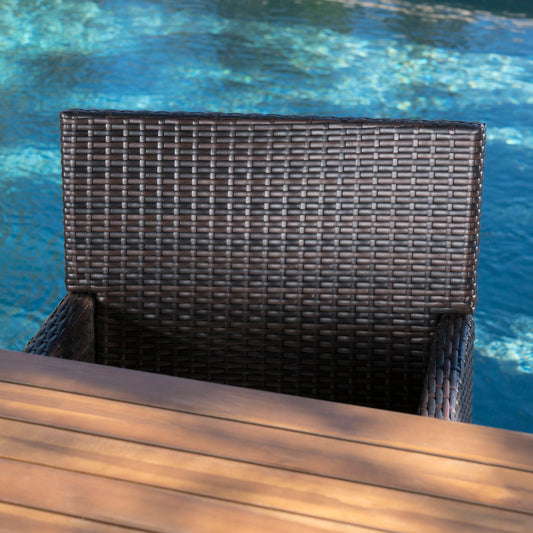 Edna Outdoor 7 Piece Acacia Wood and Wicker Dining Set, Teak with Multi Brown Chairs