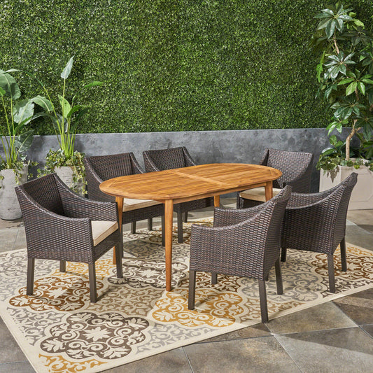 Stanford Outdoor 7-Piece Acacia Wood Dining Set with Wicker Chairs