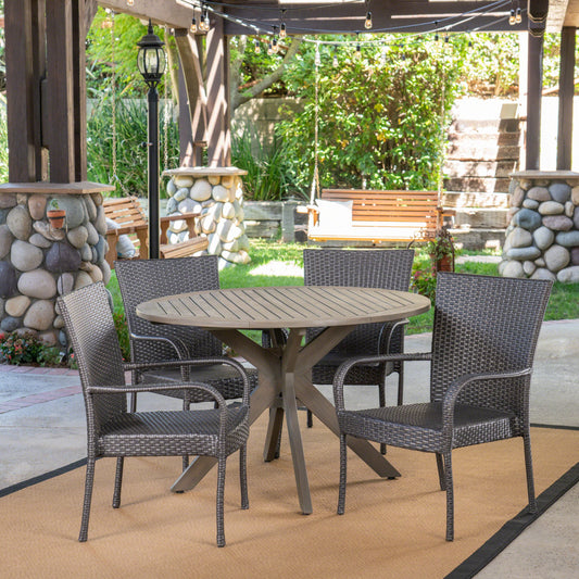 Layna Outdoor 5 Piece Wood and Wicker Dining Set, Gray and Gray