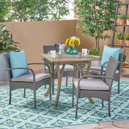 Derek Outdoor 5 Piece Wood and Wicker Square Dining Set, Gray and Gray