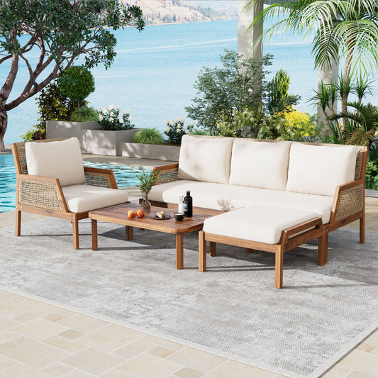 Gossame 4 Piece Acacia Wood Patio Furniture Set, Outdoor Wicker Furniture Sectional Sofa Set with Coffee Table, 5 Seats Sofa Deep Seating with Soft Cushions