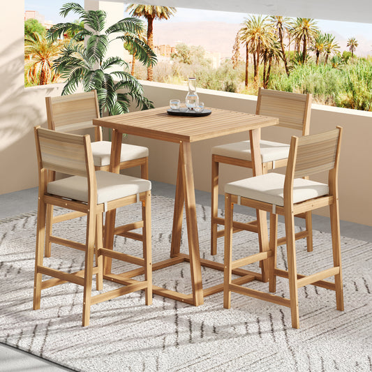 5 Pieces Acacia Wood Outdoor Patio Bar Set, Modern Boho Bar Height Chair Bar Table, Soft Seat Cushions, Rattan Dining Bar Set