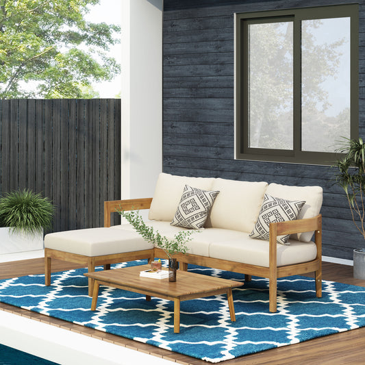 Brooklyn Outdoor Acacia Wood 3 Seater Sofa Chat Set with Ottoman, Teak and Beige