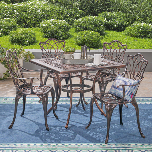 Barbara Outdoor 4-Seater Cast Aluminum Square-Table Dining Set, Shiny Copper