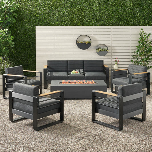 Neffs Outdoor Aluminum 7 Seater Chat Set with Fire Pit, Black, Natural, and Dark Gray