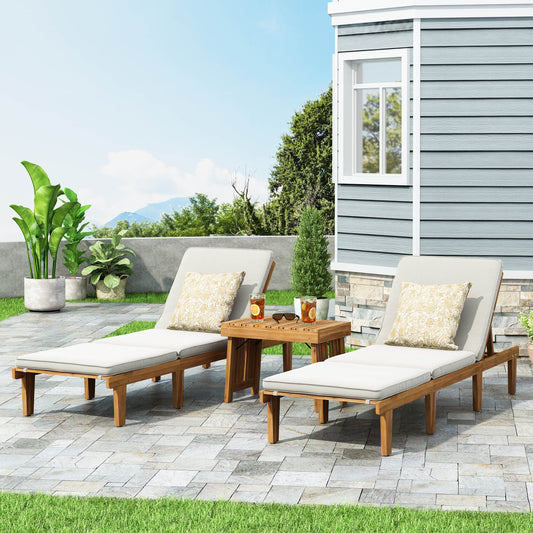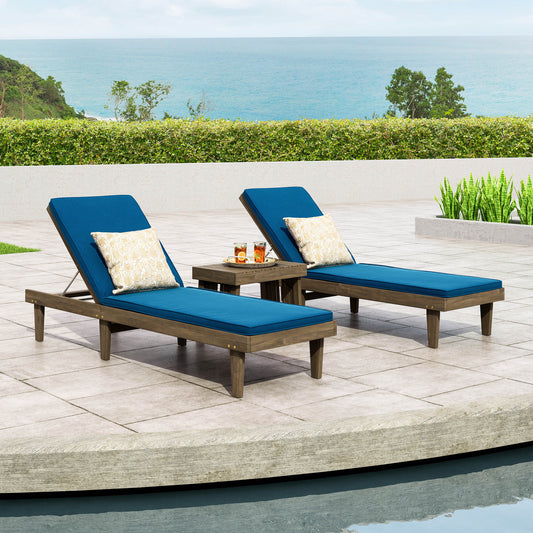 Paolo Outdoor Acacia Wood 3 Piece Chaise Lounge Set with Water-Resistant Cushions