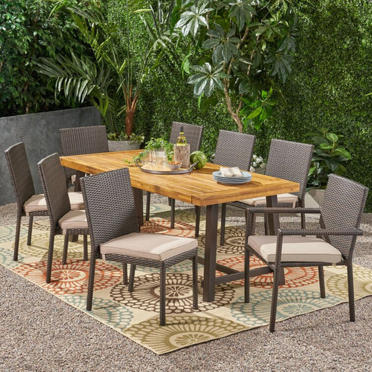 Miravibe Outdoor Acacia Wood and Wicker 9 Piece Dining Set with Cushion