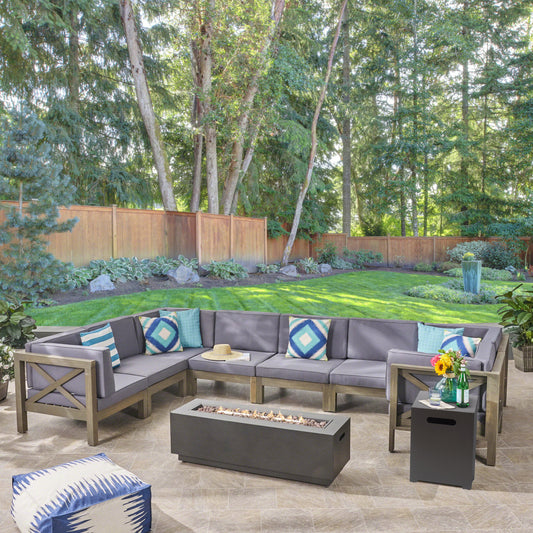 Muriel Outdoor Farmhouse Acacia Wood 8 Seater U-Shaped Sectional Sofa Set with Fire Pit