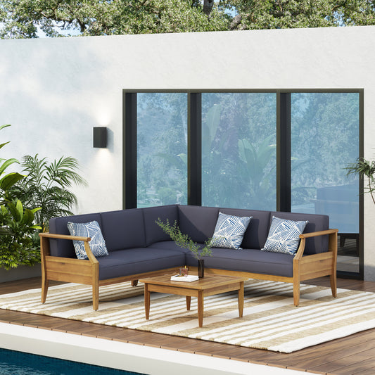 Bianca Outdoor Mid-Century Modern Acacia Wood 5 Seater Sectional Chat Set with Cushions, Teak and Dark Gray