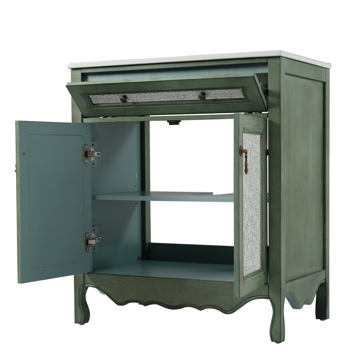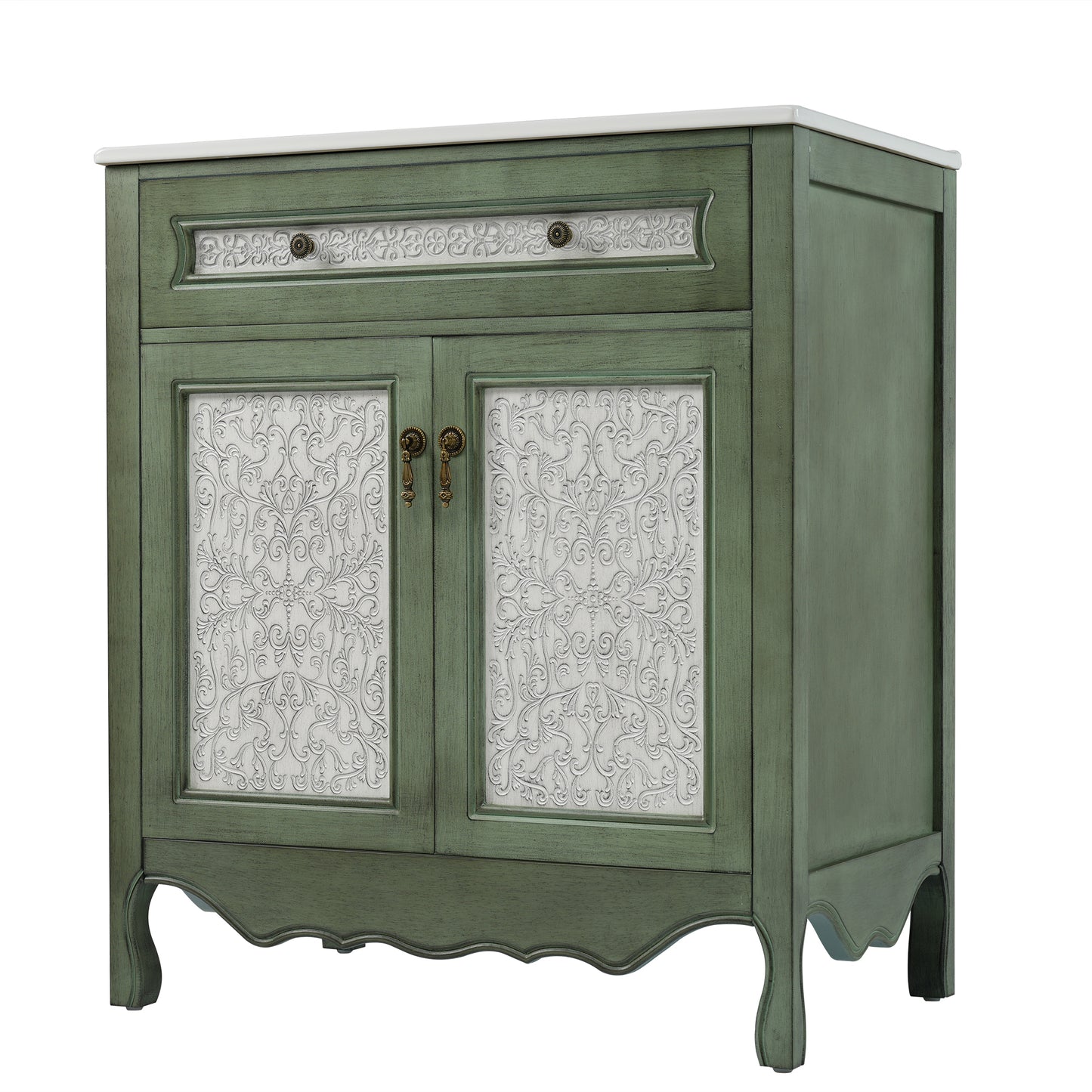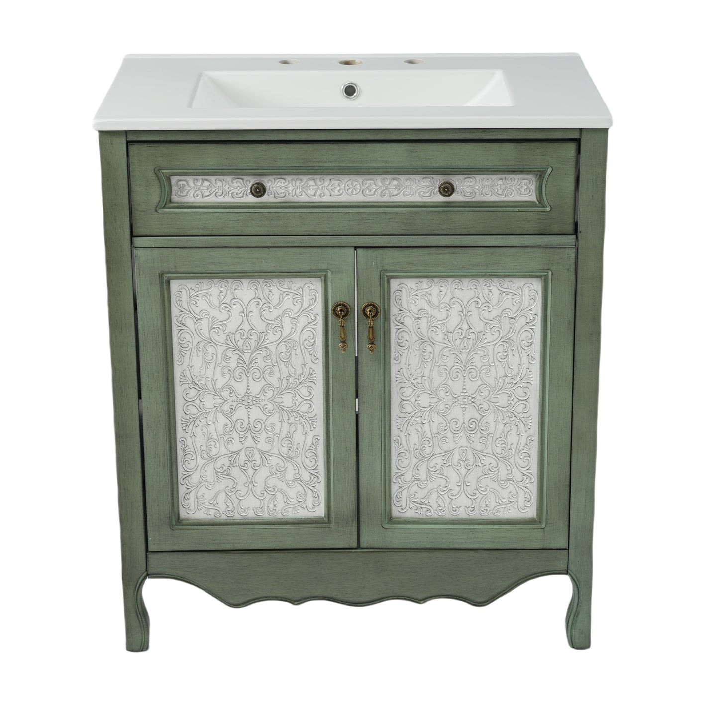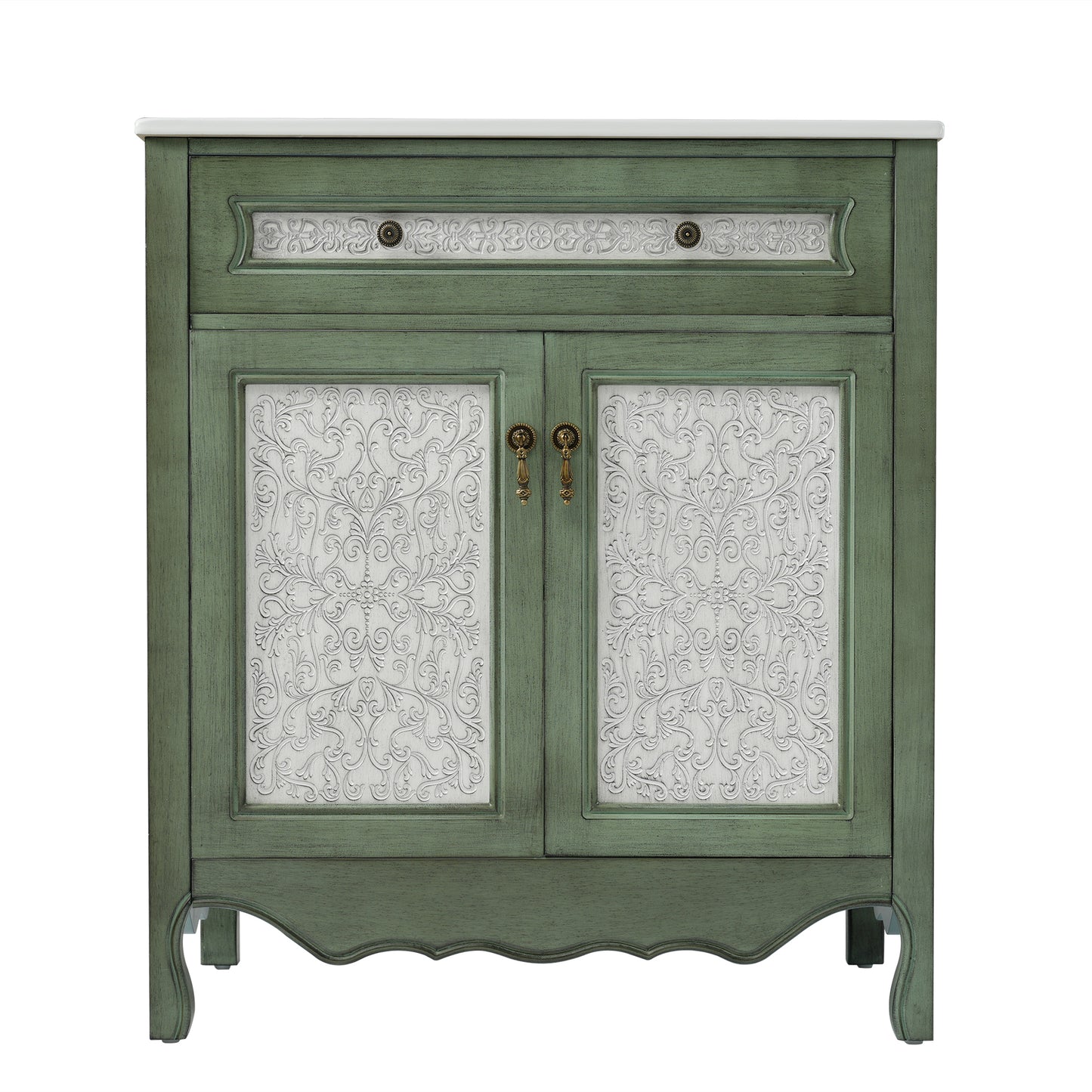 Timeless Antique Charm with Unique Pattern Design: Infuse your bathroom with elegant vintage character with this 30-inch antique pattern bathroom vanity. The antique green and blue finish, combined with intricate detailing, creates a sophisticated yet nostalgic appeal. Whether you're aiming for a rustic farmhouse, classic European, or retro-inspired aesthetic, this vanity is a statement piece that enhances any bathroom décor.