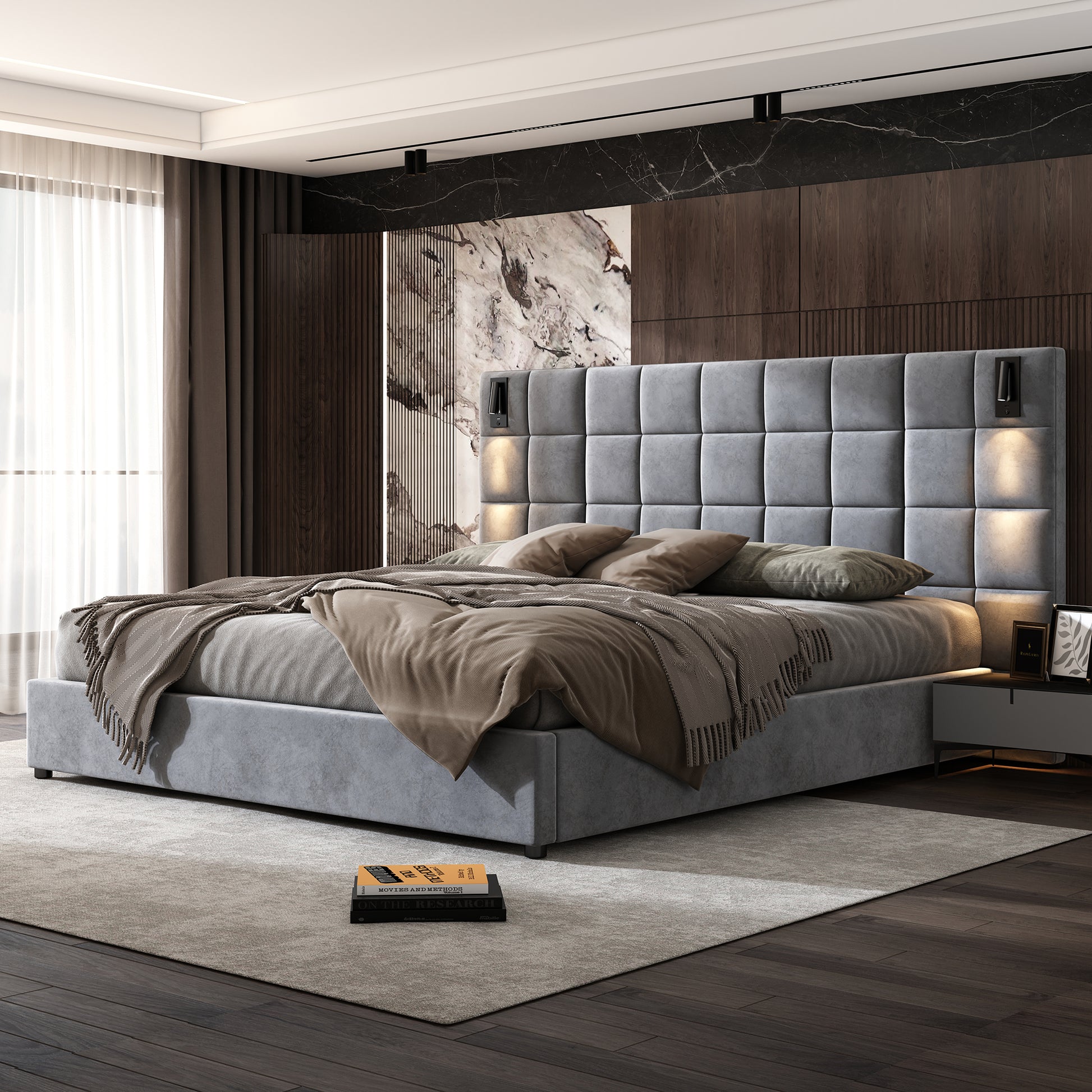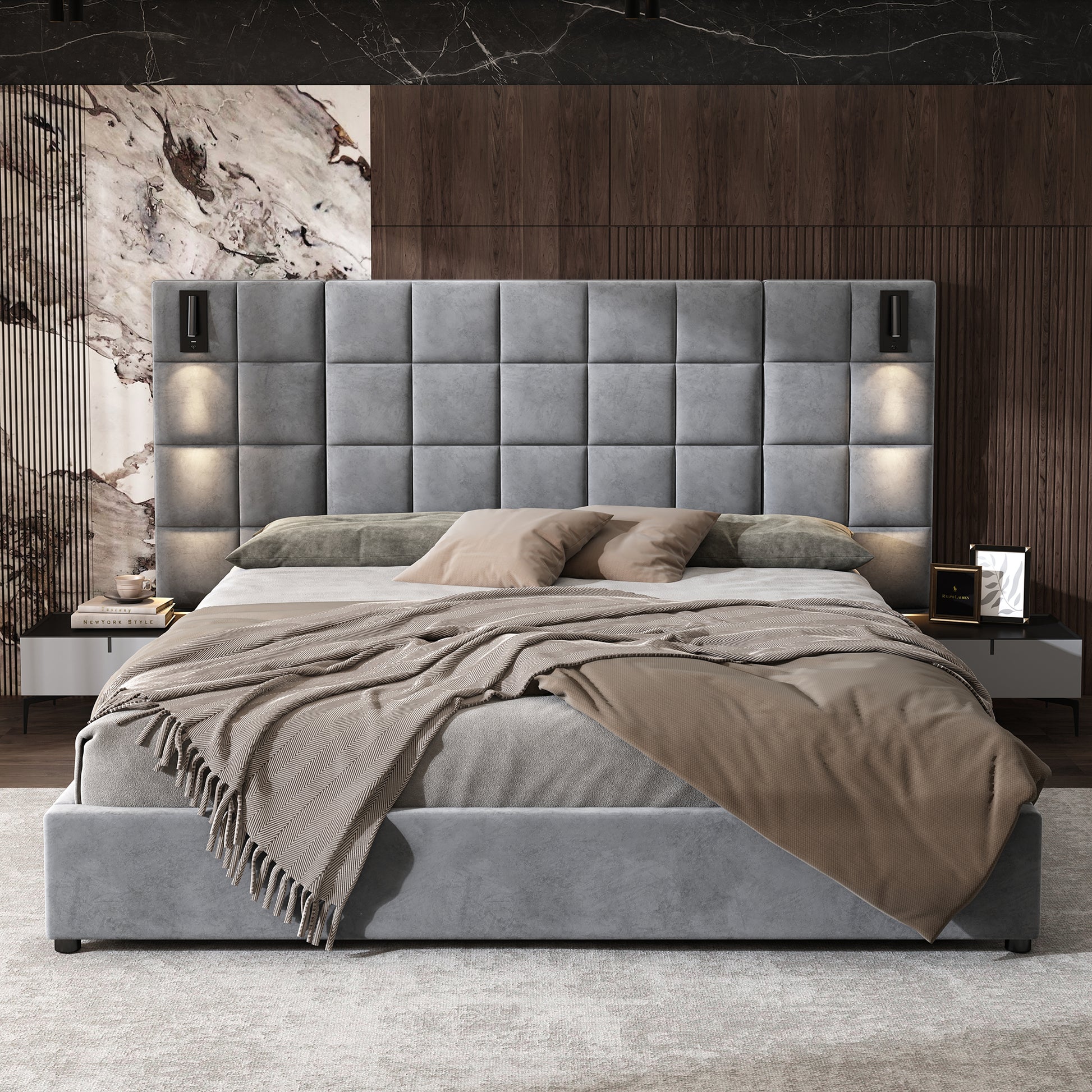 Elara Upholstered bed,with reading lamp and USB port, wide headboard,without bedside tables and mattress