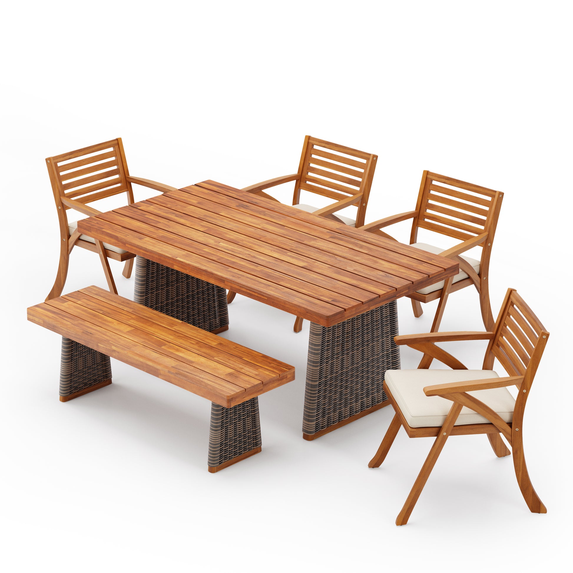 Euley Outdoor 6 Pieces Chat Set,Include 4 Dining Chair With Cushion,1 Wood Bench,1 Dining Table