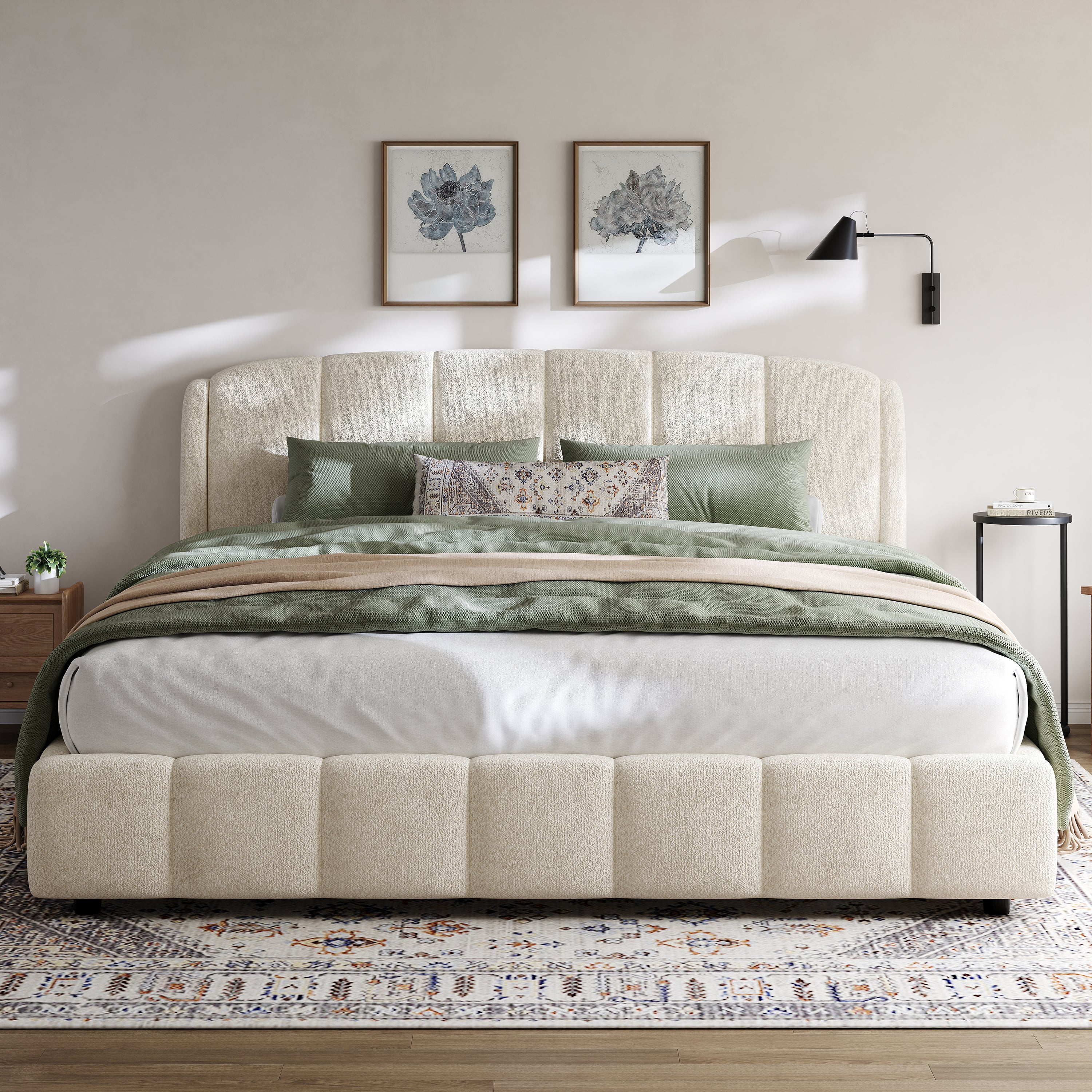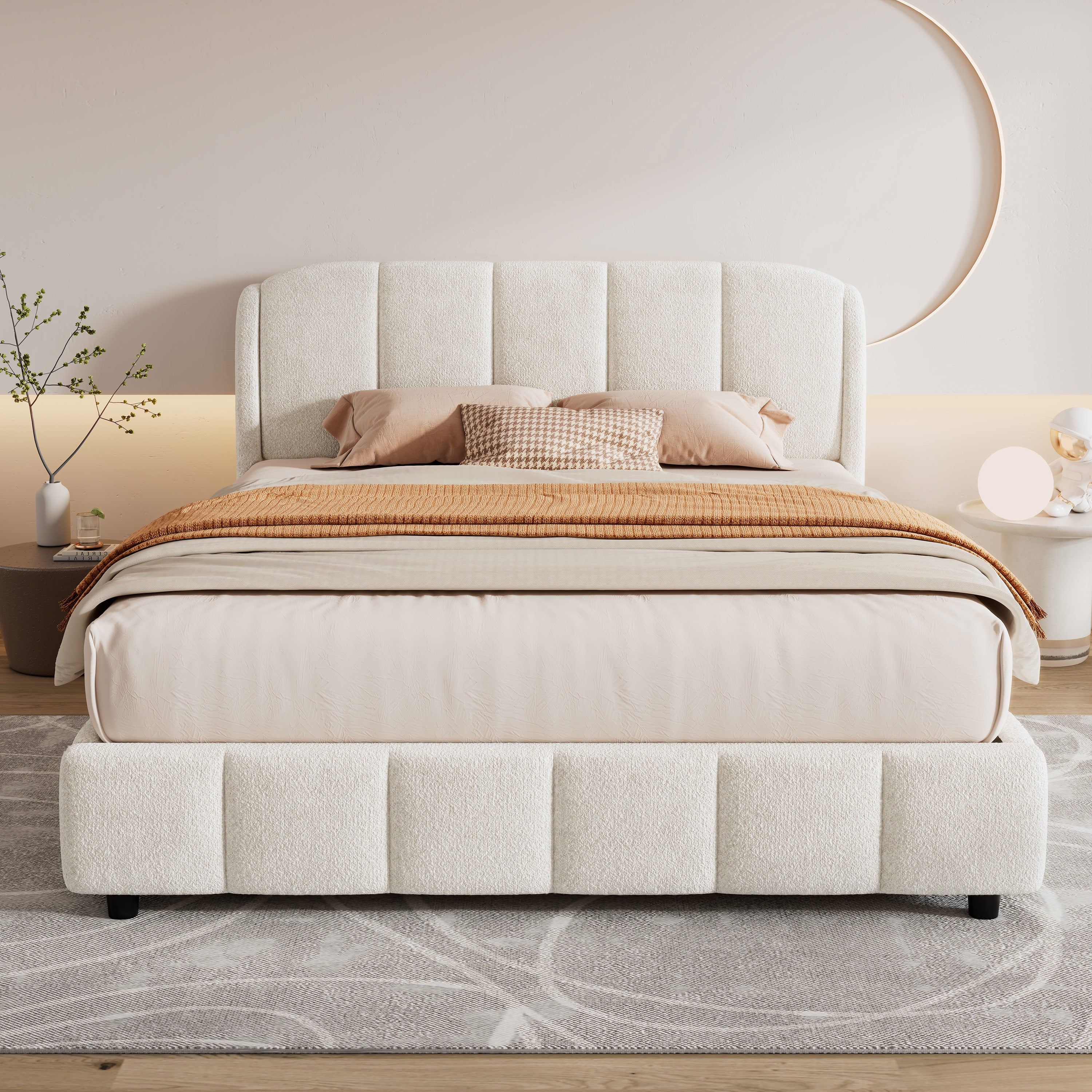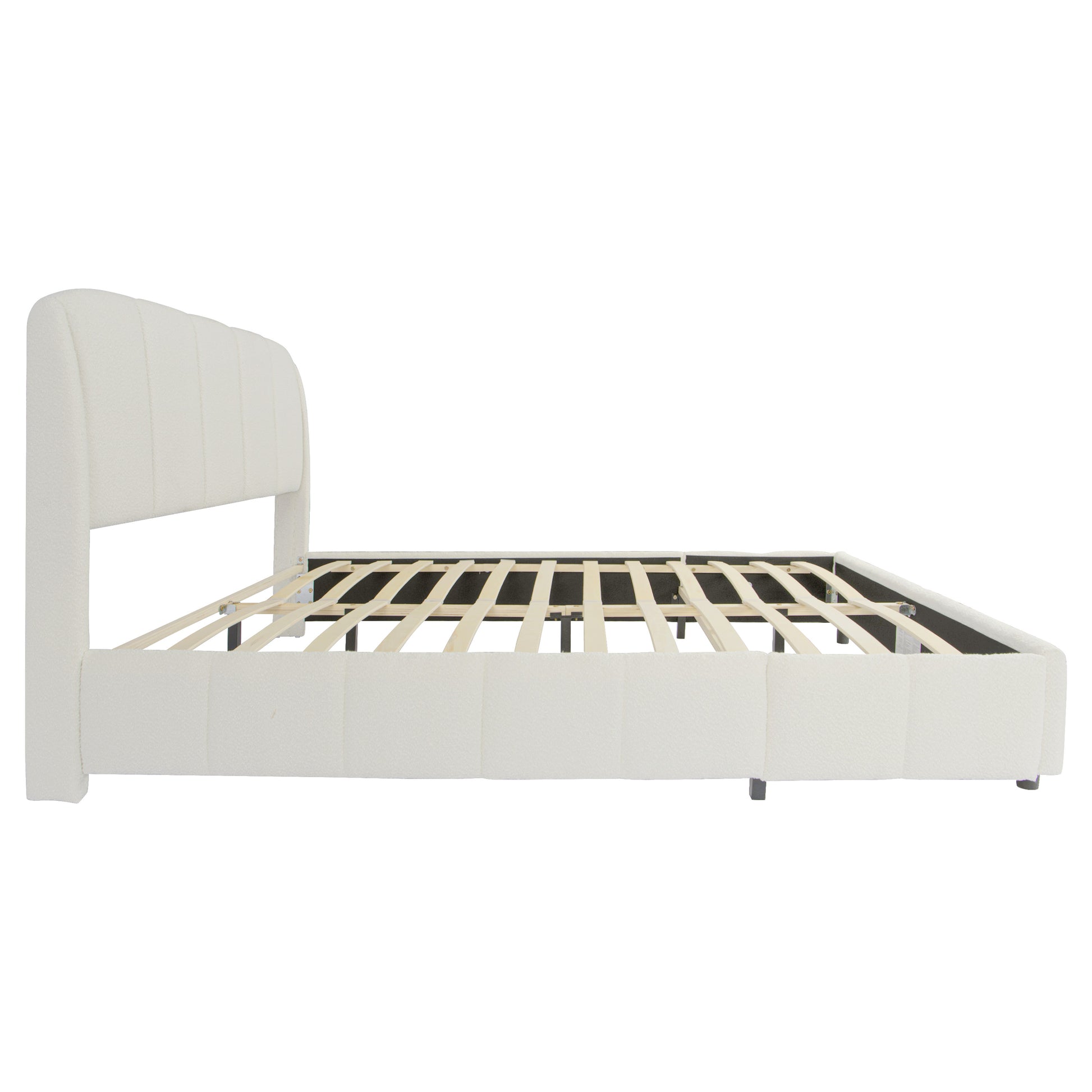 Florian Platform Bed, Soft Boucle Fabric Upholstered Platform bed with Curve-Shaped Design Headboard