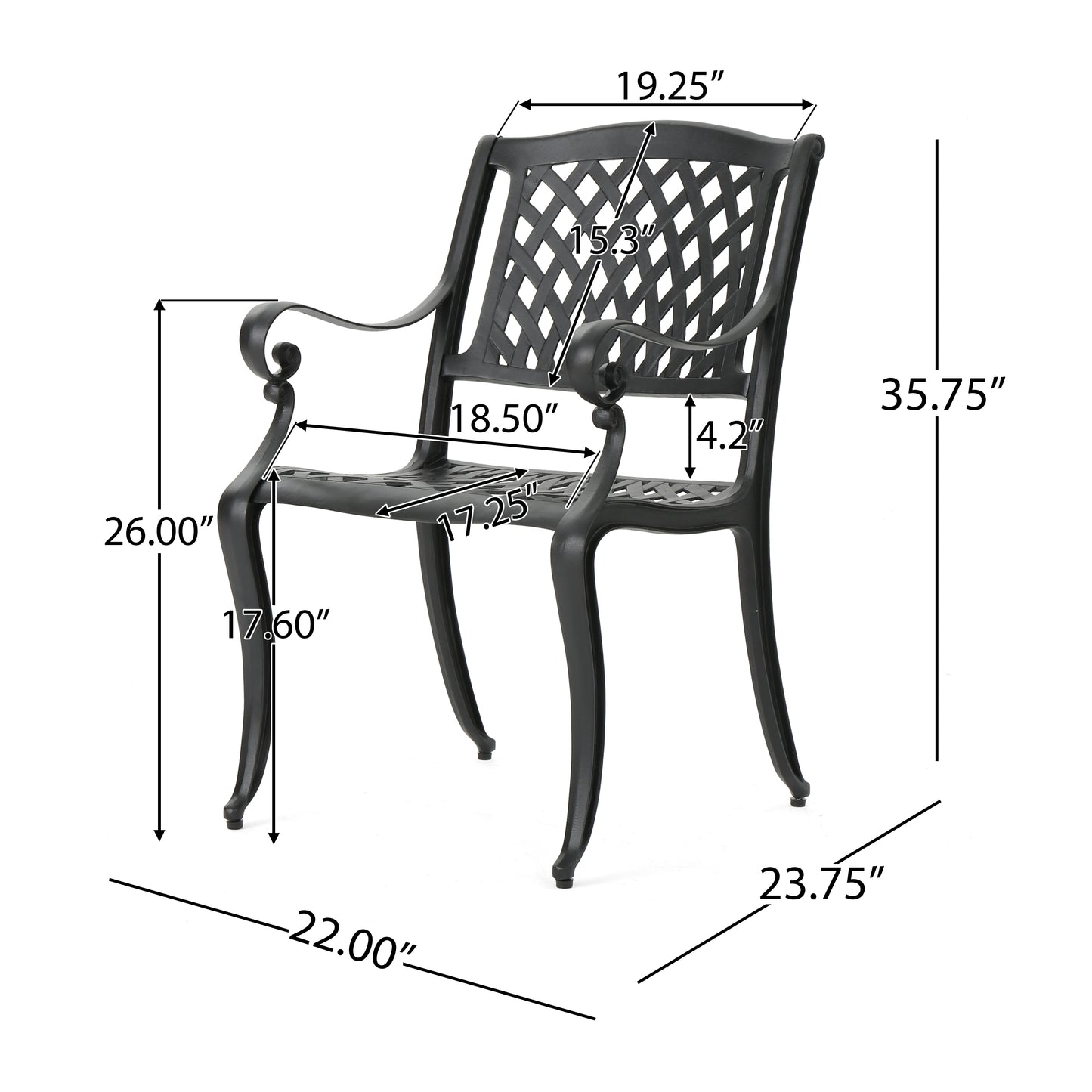 Impress your guests with a gorgeous dining set that gives your backyard or patio space an atmosphere of refined elegance. Featuring a beautiful classic look, our dining set opens any outdoor space into one of incredible design and texture. Made with cast aluminum and completed with an antique finish, this set functions as a unique centerpiece that easily seats six people. Finished with a convenient umbrella hole, this set provides you with ...