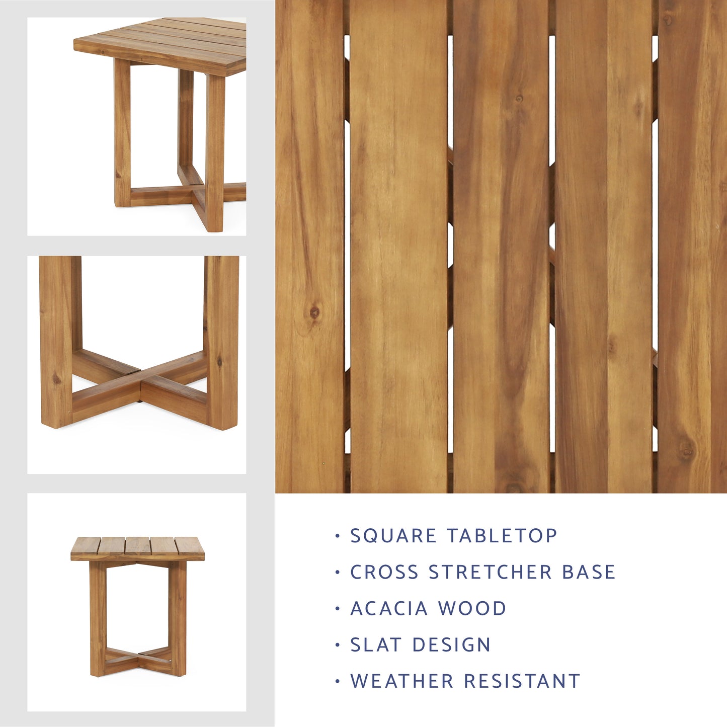 Enjoy the outdoor breeze with the help of a charming sidekick. Ideal as an end table next to your favorite seating ensemble or as an accent piece for your decor, our side table offers outstanding aesthetics and reassuring sturdiness for your outdoor space. This accessory will blend seamlessly into any space with its classic slat paneling and square tabletop. Featuring a standard cross-stretcher base and crafted with rich acacia wood, our si...