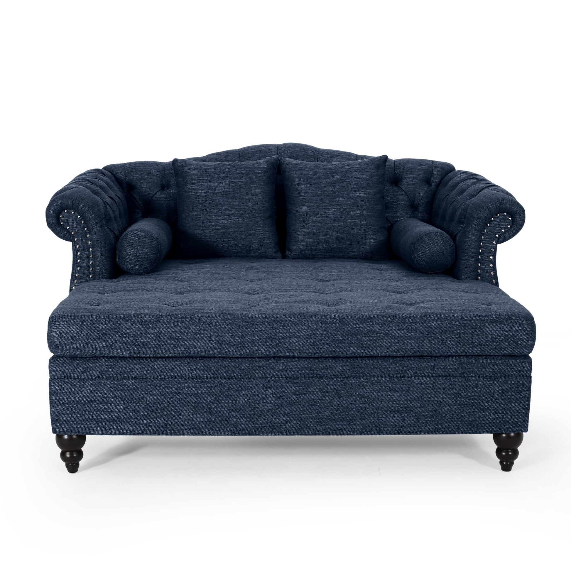 Effortlessly transform your indoor space with a luxurious accessory of comfort. Refined with traditional elements such as a stunning nailhead trim and scroll arms, our outstanding double chaise lounge is both an elegant and contemporary addition to your living room space. Featuring beautiful button tufting, diamond stitching, and beautifully turned legs, this chaise lounge is the perfect spot to stretch out in relaxation. Finished with two ...