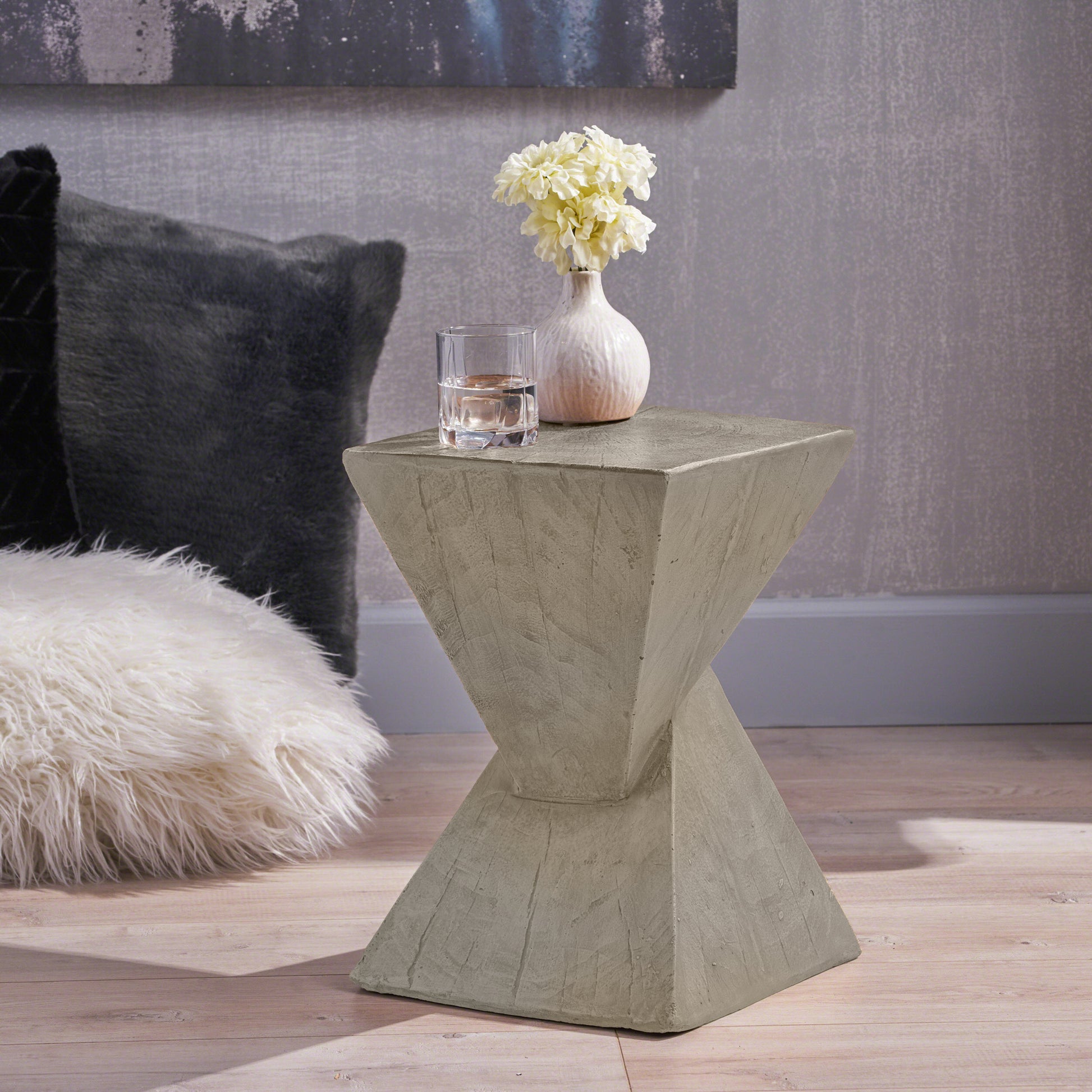 Turn your space into one that is worthy of a top-notch art gallery. This wonderfully sleek accent table brings both your indoor and outdoor spaces a modern aesthetic that is far from ordinary. Featuring an eye-catching twisted hourglass design crafted from lightweight concrete, this accessory not only offers a stylish aesthetic but is also a durable structure. Complemented by a wood-like finish, including a dark knotted look gracing its tab...