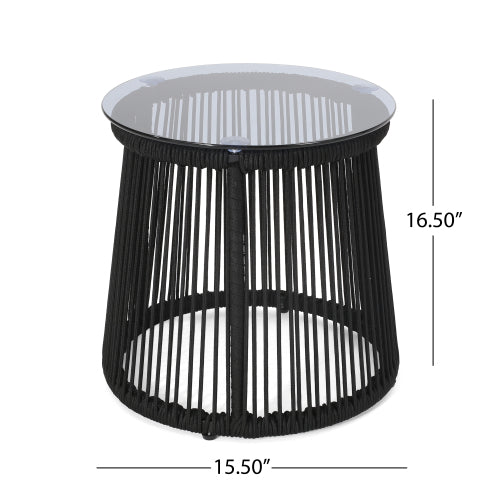 Laycee Modern Outdoor Rope Weave Side Table with Tempered Glass Top