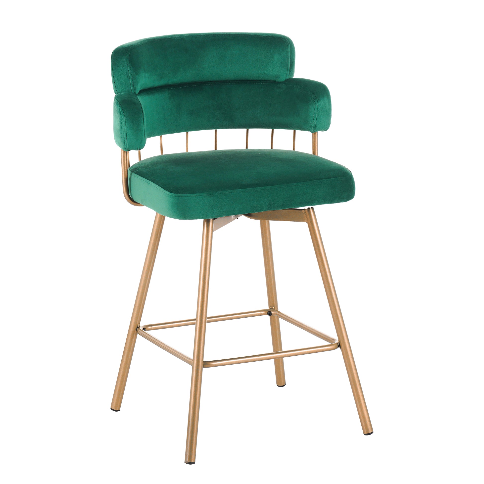 [Stylish and Comfortable Design]This 180° swivel upholstered bar stool features a modern industrial style with a bucket-shaped seat and tiered backrest, offering both comfort and aesthetics. The seat can rotate 90 degrees left or right and has an auto-return function. The iron frame and golden legs add elegance, making it ideal for kitchen islands, cafes, or pubs. Available in two colors, it fits various decor styles.