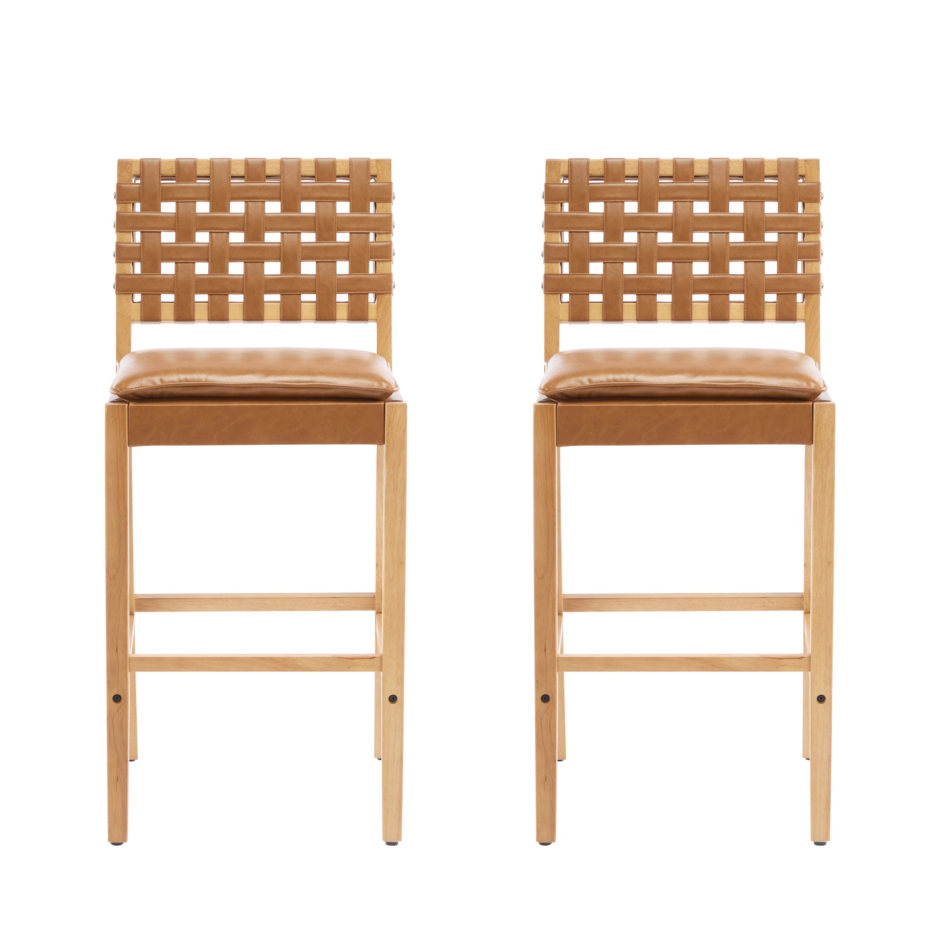 Rieti lndoor Wooden Barstool, Natural Finished Frame with Brown Upholstery, Set of 2