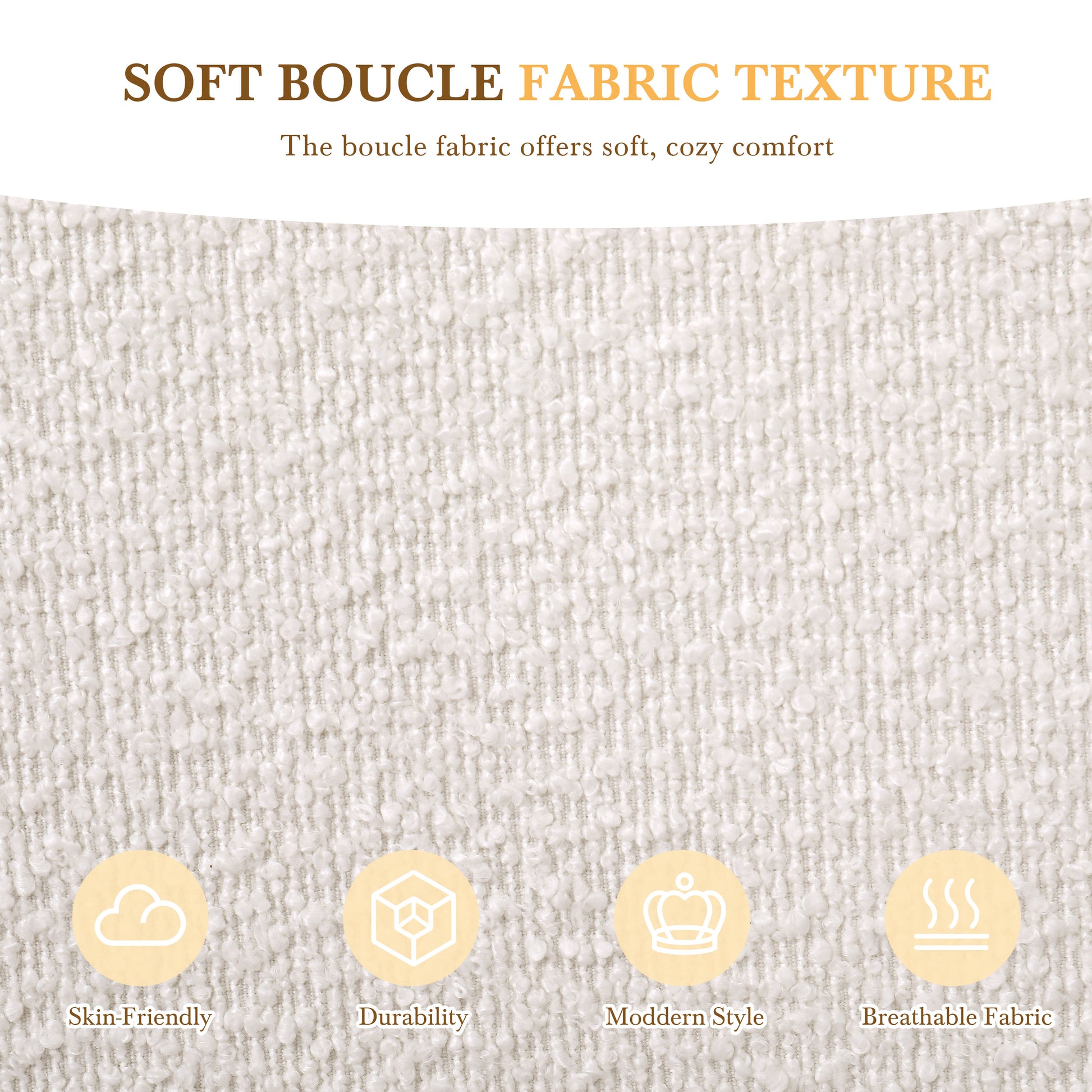 - Soft and exquisitely boucle fabric. Indulge in the luxurious embrace of our sumptuously soft and exquisitely boucle. This fabric promises not only unparalleled comfort but also an elegant touch that transforms any space into a haven of sophistication and warmth.